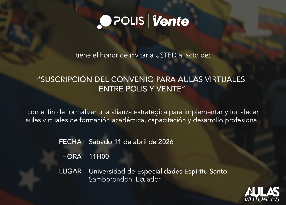Samborondón, Ecuador. La academia Polis y el movimiento Vente darán un paso decisivo en su proyecto conjunto de formación política este sábado 11 de abril de 2026, con la suscripción oficial del convenio que da vida a las Aulas Virtuales Polis-Vente, una plataforma digital concebida para llevar la formación académica, la capacitación y el desarrollo profesional de los cuadros del movimiento a cualquier rincón del mundo donde hoy se encuentra la comunidad venezolana.