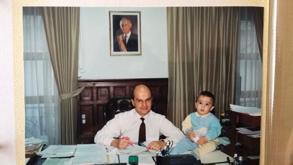 Palacio de Carondelet, 1990s: Carlos Emilio bebé en el escritorio del despacho de su padre, Carlos Larreátegui Nardi, Secretario de la Administración durante el gobierno de Sixto Durán-Ballén (1992–1996). Por esos años, su abuelo Carlos Larreátegui Mendieta era Procurador General del Estado. Invitamos a leer la entrevista a Carlos Larreátegui Nardi publicada por Mundo Diners.