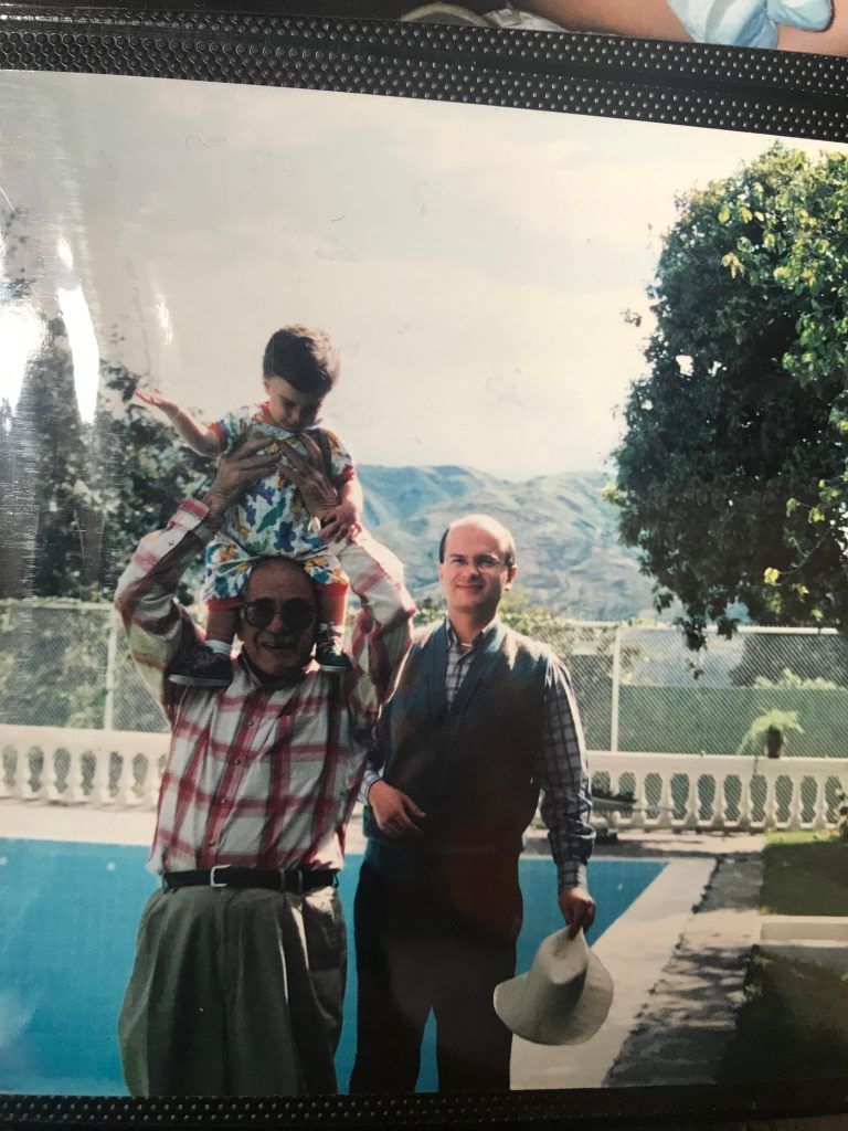 Recuerdo de 1995: Carlos Emilio niño en hombros de su abuelo Carlos Larreátegui Mendieta, uno de los fundadores de la Universidad de Las Américas. A la derecha, su padre Carlos Larreátegui Nardi, actual Canciller de la UDLA.