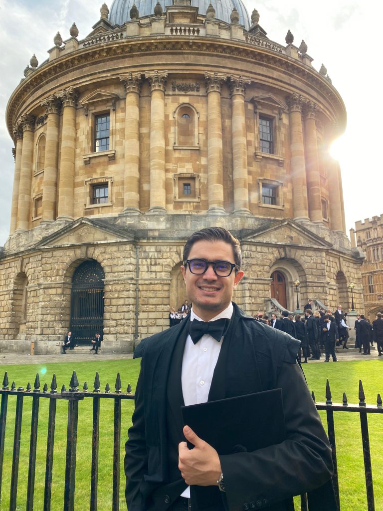 Oxford, 2022, Frente a la Radcliffe Camera. Carlos Emilio Larreátegui celebra la obtención del Máster en Políticas Públicas (MPP) en la Universidad de Oxford.